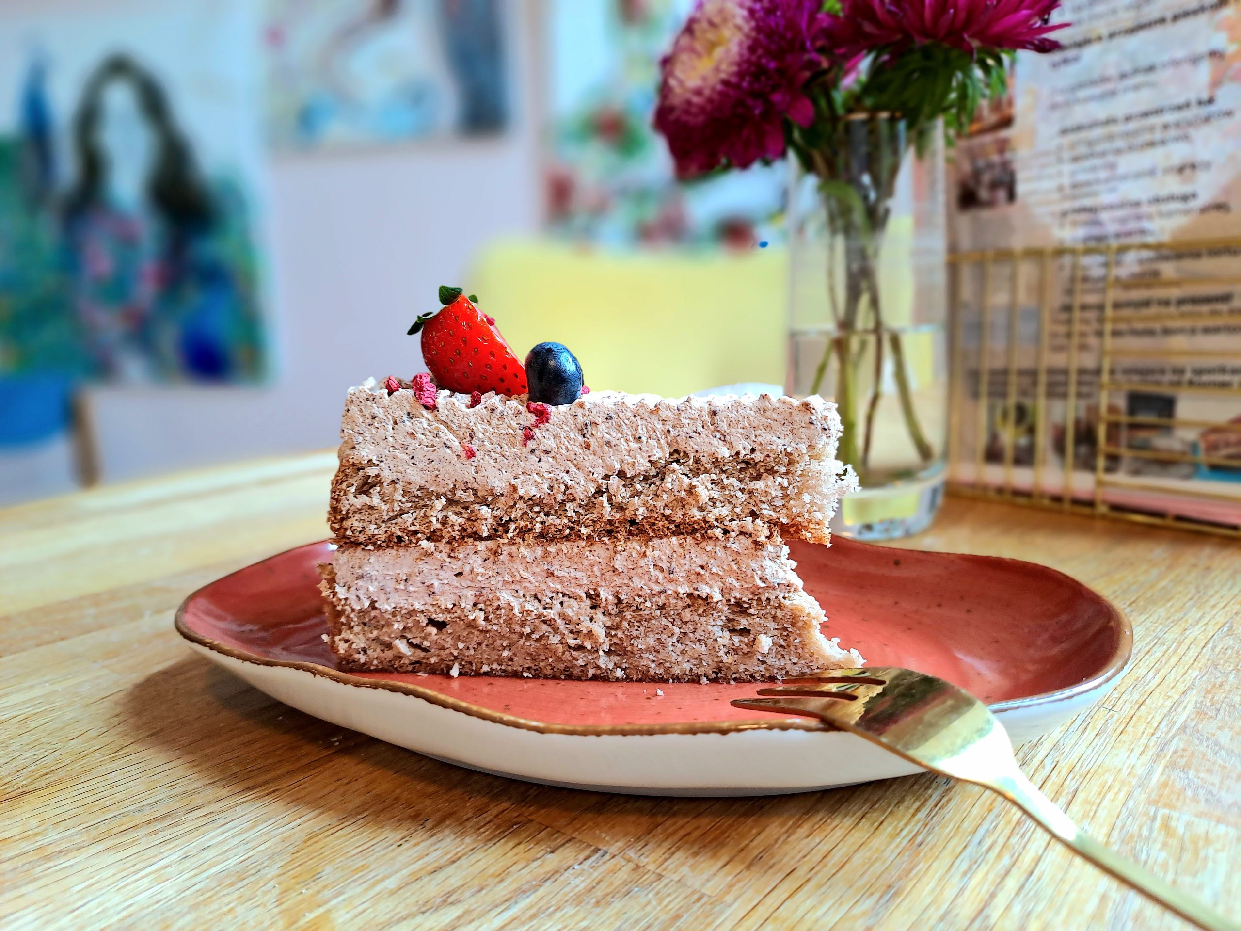 To jedno z ciast, które przywodzi jeszcze na myśl ciepłe, letnie dni – czyli orzeźwiający i soczysty Jogurtowiec. Wygląda niezwykle kusząco: spód to delikatna, miękka warstwa przypominająca musli, stworzona z płatków owsianych i daktyli, a na niej zbita, waniliowa masa jogurtowa o strukturze kremowej galaretki, imitującą sernik na zimno. Całość wieńczy malinowa galaretka z całymi owocami. Kompozycja warstw idealnie się uzupełnia – ciasto jest soczyste, lekkie i niezwykle przyjemne w smaku. W sam raz na pożegnanie lata.