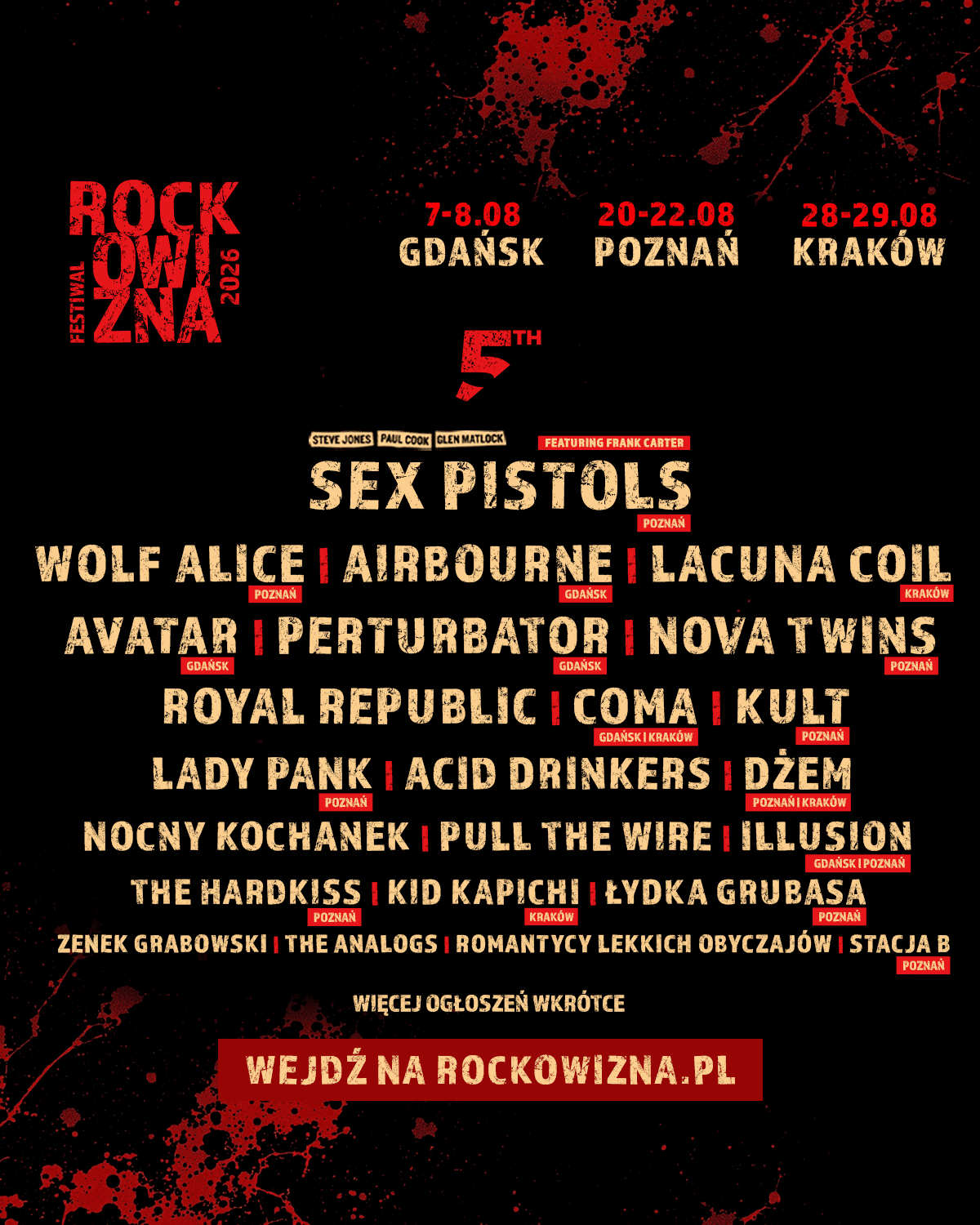LINE-UP POZNAŃ: SEX PISTOLS feat. Frank Carter | WOLF ALICE | NOVA TWINS | ROYAL REPUBLIC | KULT | LADY PANK | ACID DRINKERS | DŻEM | NOCNY KOCHANEK | PULL THE WIRE | ILLUSION | THE HARDKISS | ŁYDKA GRUBASA | ZENEK GRABOWSKI | THE ANALOGS | ROMANTYCY LEKKICH OBYCZAJÓW | STACJA B