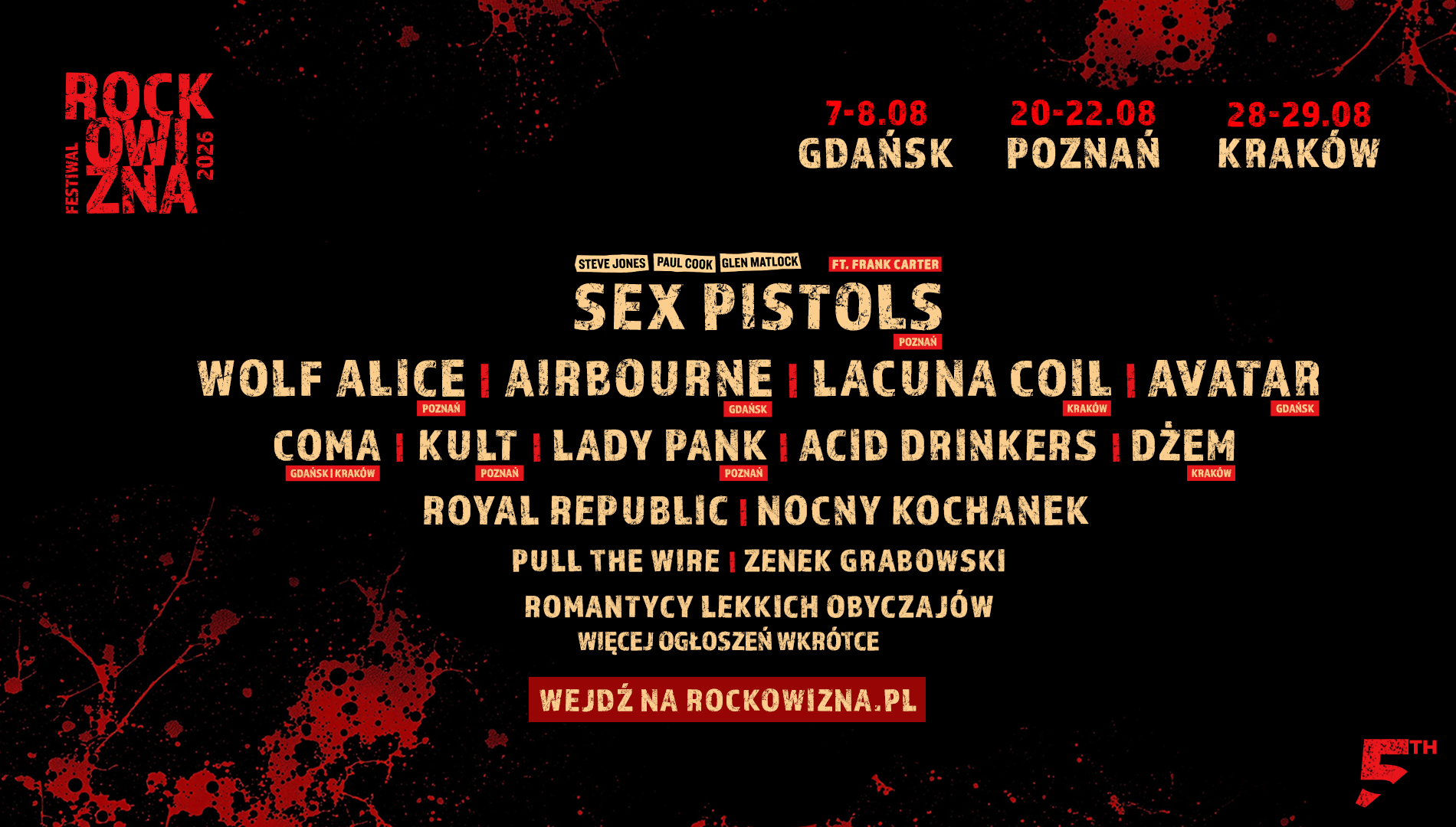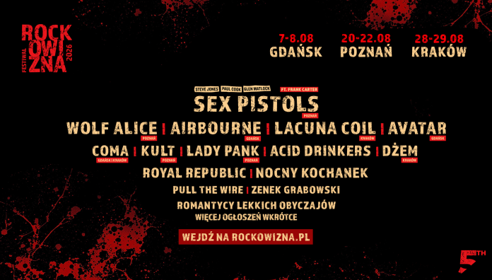 Znamy już pierwszych artystów. Wystąpią: SEX PISTOLS feat. FRANK CARTER (Poznań) WOLF ALICE (Poznań) AIRBOURNE (Gdańsk) LACUNA COIL (Kraków) AVATAR (Gdańsk) COMA (Gdańsk | Kraków) KULT (Poznań) LADY PANK (Poznań) ACID DRINKERS (Gdańsk | Poznań | Kraków) DŻEM (Kraków) ROYAL REPUBLIC (Gdańsk | Poznań | Kraków) NOCNY KOCHANEK (Gdańsk | Poznań | Kraków) PULL THE WIRE (Gdańsk | Poznań | Kraków) ZENEK GRABOWSKI (Gdańsk | Poznań | Kraków) ROMANTYCY LEKKICH OBYCZAJÓW (Gdańsk | Poznań | Kraków) Więcej ogłoszeń wkrótce!